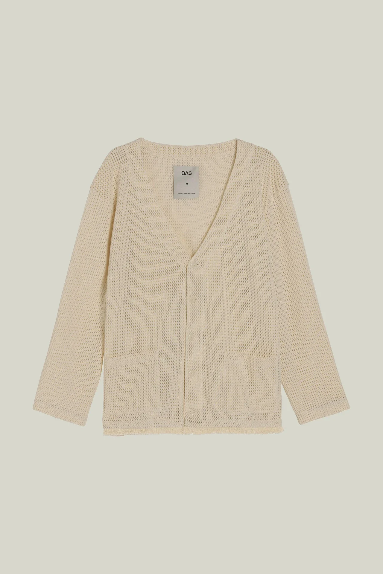 The Ecru Net Cardigan is made in an unbleached cotton bobbinet weave, offering airy lightness to summer layering. The relaxed silhouette features two patch pockets and a V-neck front finished with mother of pearl buttons.
