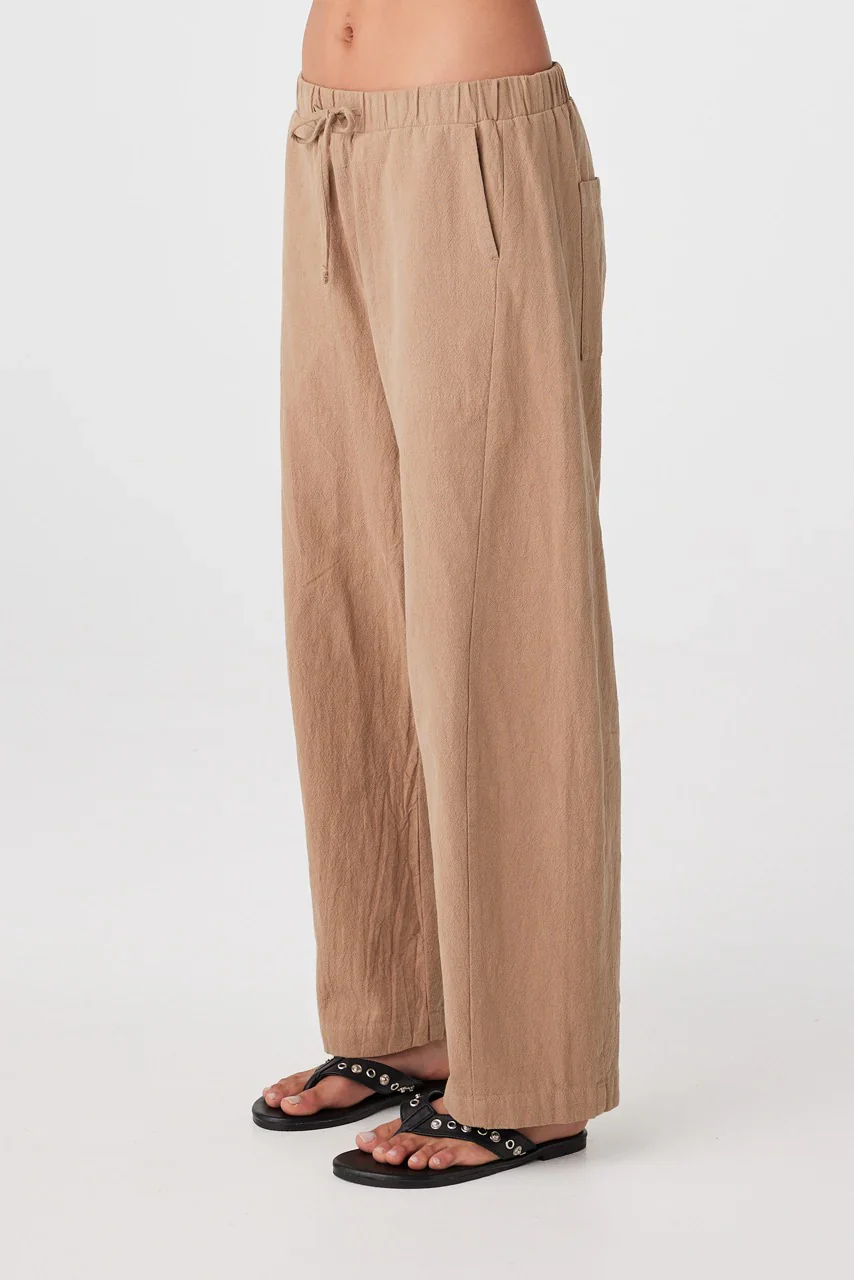 Relaxed barrel-leg pants in a lightweight blend of 55% linen and 45% cotton. Elasticated waistband with drawstring and front and back patch pockets. Naturally breathable and soft for warm or humid days, easy for everyday wear or travel.