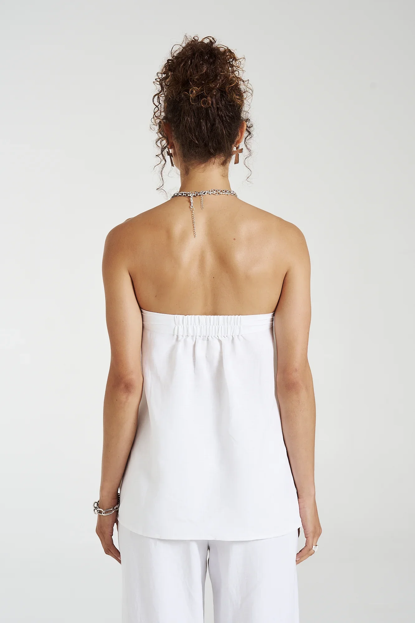 Crafted from a double layered linen blend, our STRAPLESS SHIFT TOP in ANGELIC WHITE offers both style and functionality. Its strapless design is complemented by a non-slip lining, ensuring a secure and comfortable fit.Ā