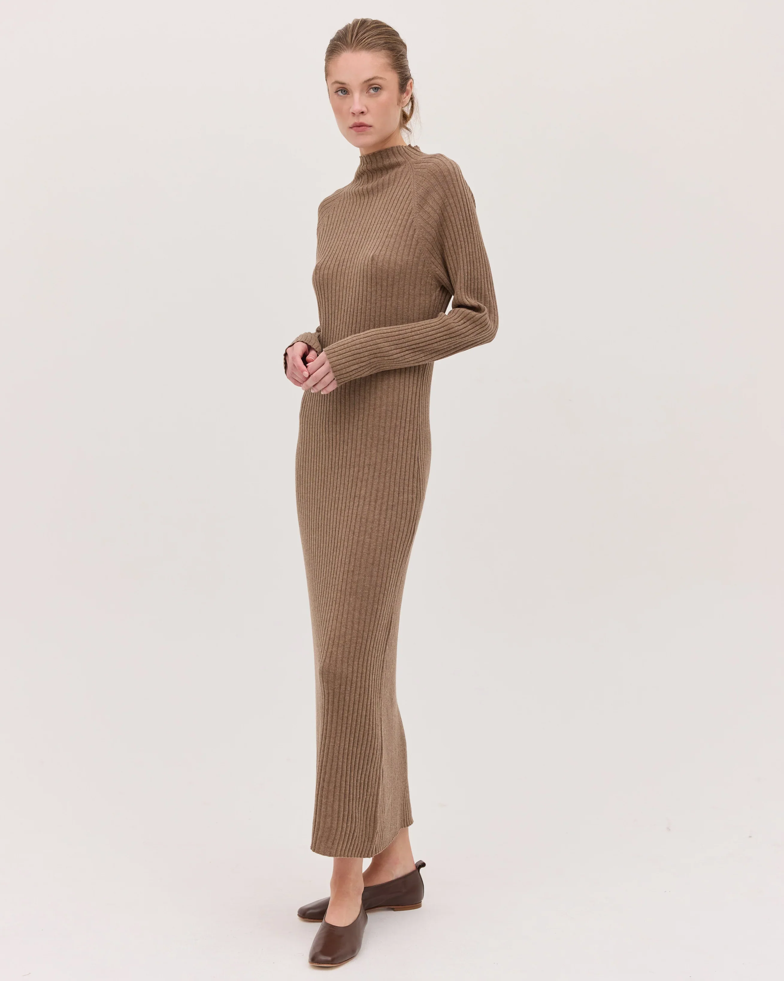 Crafted from a blend of 45% RWS merino wool and 55% organic cotton, this long-length rib knit dress features long sleeves and a flattering, fitted silhouette. Soft, breathable, and effortlessly elegant.
